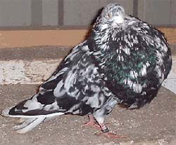 (Spanje, Cadis (Andalusië)): temperamentvolle duif, gemiddelde grootte, iets opgerichte houding, volblazende krop en rijke bevedering.